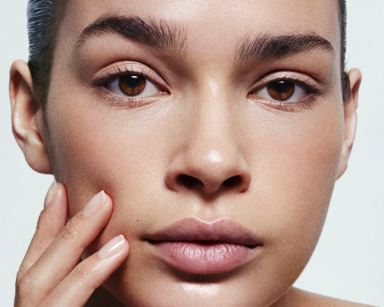 Gros plan sur le visage d'une femme à la peau claire, aux yeux marron clair et aux sourcils épais, avec une main touchant sa joue.