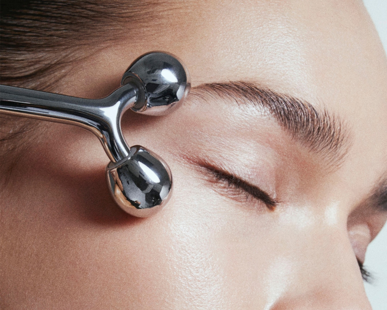 Gros plan sur un outil de massage facial argenté utilisé sur le front d'une personne aux yeux fermés, pour une peau éclatante et détendue.
